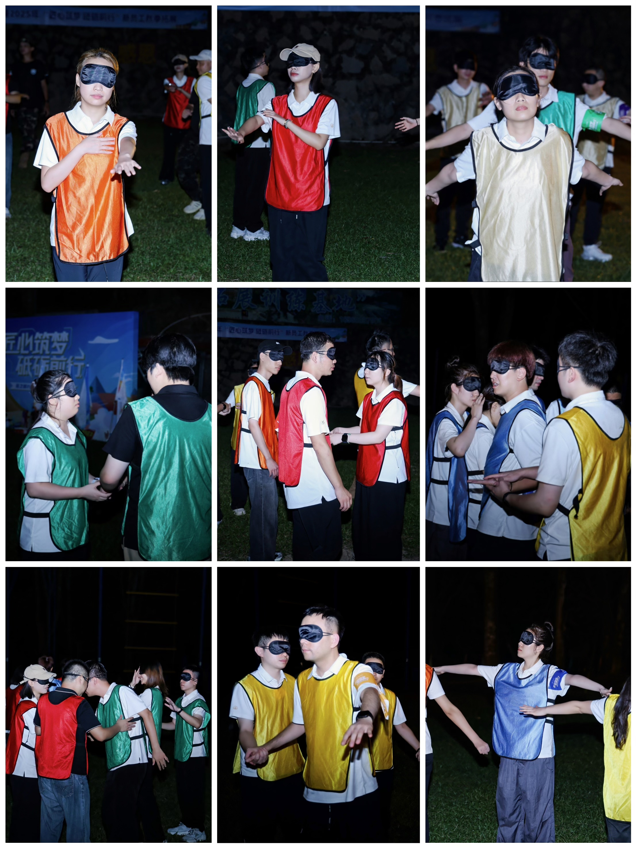 隨著夜幕降臨,“找回團隊”項目將整場拓展推向新的高潮。隊員們被蒙住雙眼,在黑暗中尋找隊友,每當遇到人的時候只能通過除語言外的其他方式及彼此默契來確認是否是團隊同伴。游戲過程中,已經找回的隊友會被教官重新拆散,團隊不僅需要再次找回成員,還需要緊緊守護隊友,堅定彼此的選擇。那一刻,嘈雜的干擾聲遠去,只留下對伙伴的信任指引方向。當雙手終于相握,這份在困境中建立的羈絆,讓團隊的凝聚力愈發堅實。隨后的復盤會上,隊員們圍坐分享收獲、梳理經驗,再一次體會到團隊信任與凝聚的力量。