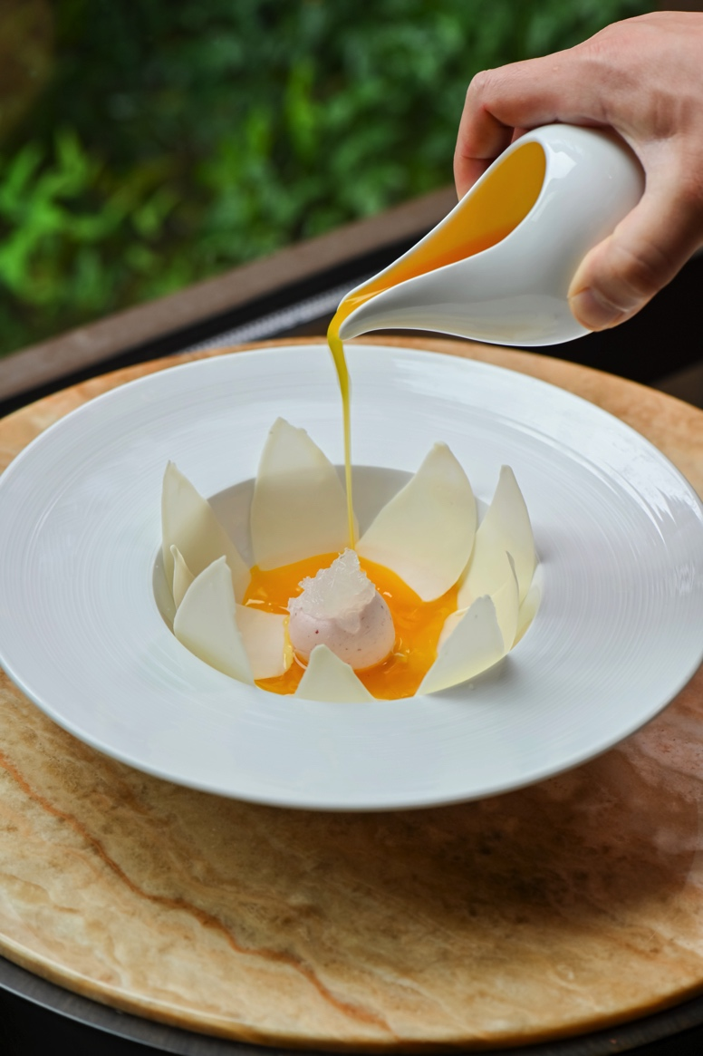 玉蘭花開映燕盞,是一道展現廚藝美學的匠心之作。白巧克力制成花瓣,包裹草莓慕斯花心,在溫潤芒果汁液的澆淋下仿若漸次綻放。燕窩藏于花蕊,細膩口感與靈動形態共同演繹出食境合一的東方意境。