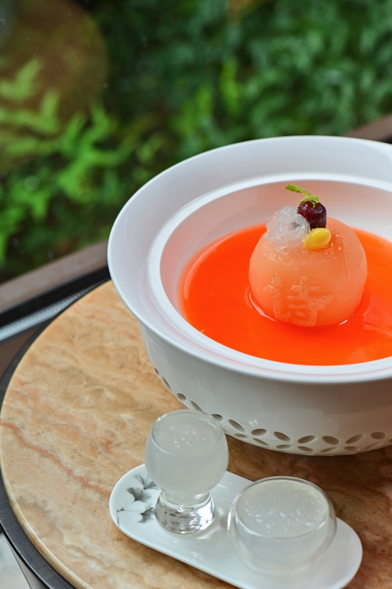 金巢玉露應燕歸,取形制優美的菊瓜為器,蒸至甘軟后注入香濃椰奶,綴入繽紛鮮果與晶瑩燕窩。瓜體的清甜與椰韻的馥郁相融,燕絲穿梭其間,營造出豐富而和諧的味覺體驗,寓意金秋歸巢,溫潤養人。